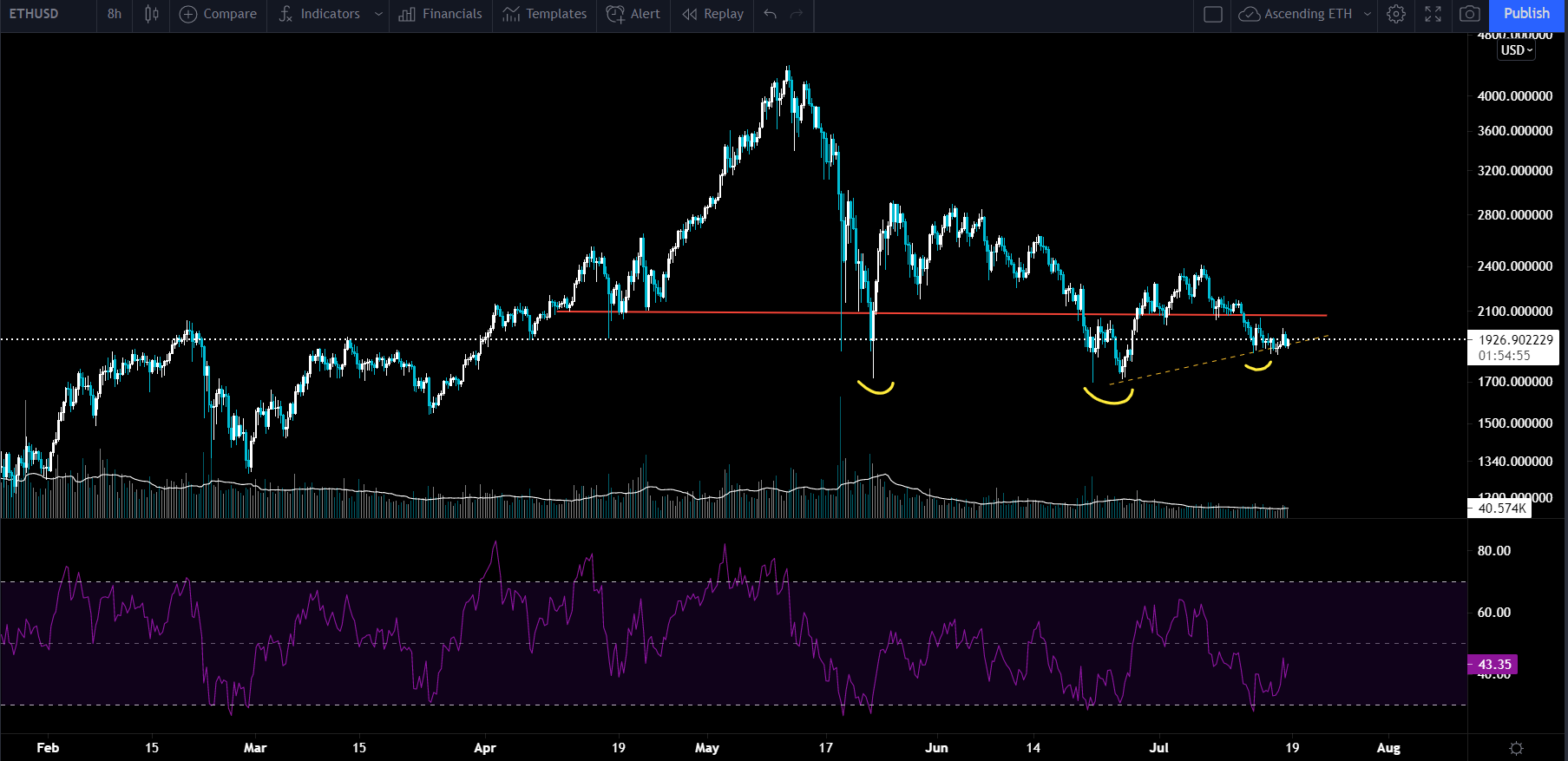 ETH has seen a wild ride this year. There is a potential Buy signal forming - Inverse Head and Shoulders (IHS). The purple line is the RSI, which has bounced at all three points defining the IHS. The last piece to the puzzle would be ETH retracing back above $2,100. This would be a good time to scale into a long position for the short to mid term (a month of two). We are still cautious as the entire crypto-market is still experiencing the pain of the early summer sell off.