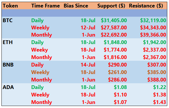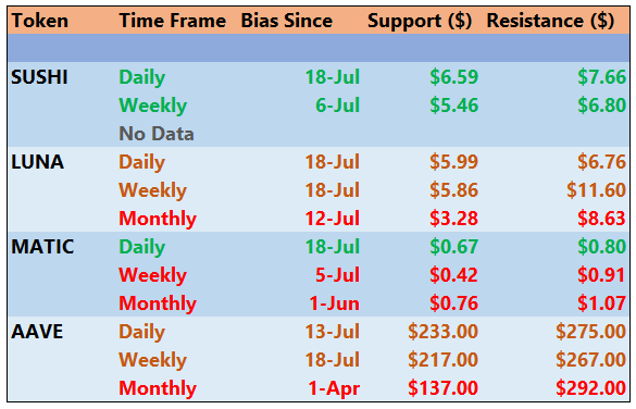 Red = Bearish, Green = Bullish, Brown = Neutral since the date given in “Bias Since”. Support levels are where the price could bounce when falling and Resistance levels are where the price could stop if rising. You can find more details on how to read the cheat sheet here.