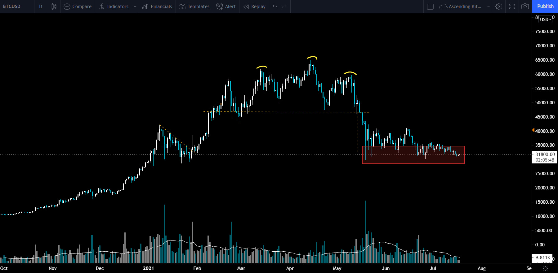 The current situation: Those on-chain metrics are still indicating large buyers are scooping up coins, and if the H/S top was meaningful to price, its done its thing and is no longer relevant. You can see the red rectangle drawn on the chart above shows the price being bought up quickly on drops near $30k.