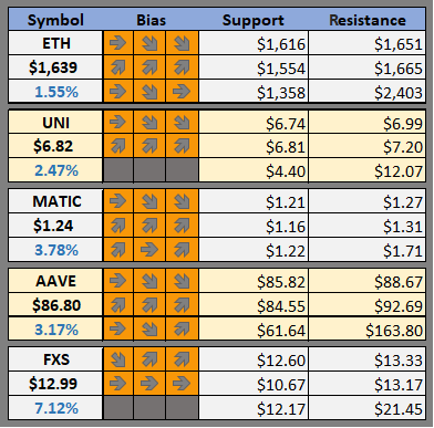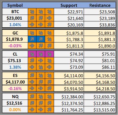 Support and resistance levels and our daily, weekly and monthly bias on BTC, GC, CL, ES, and NQ as well as our favorite altcoins