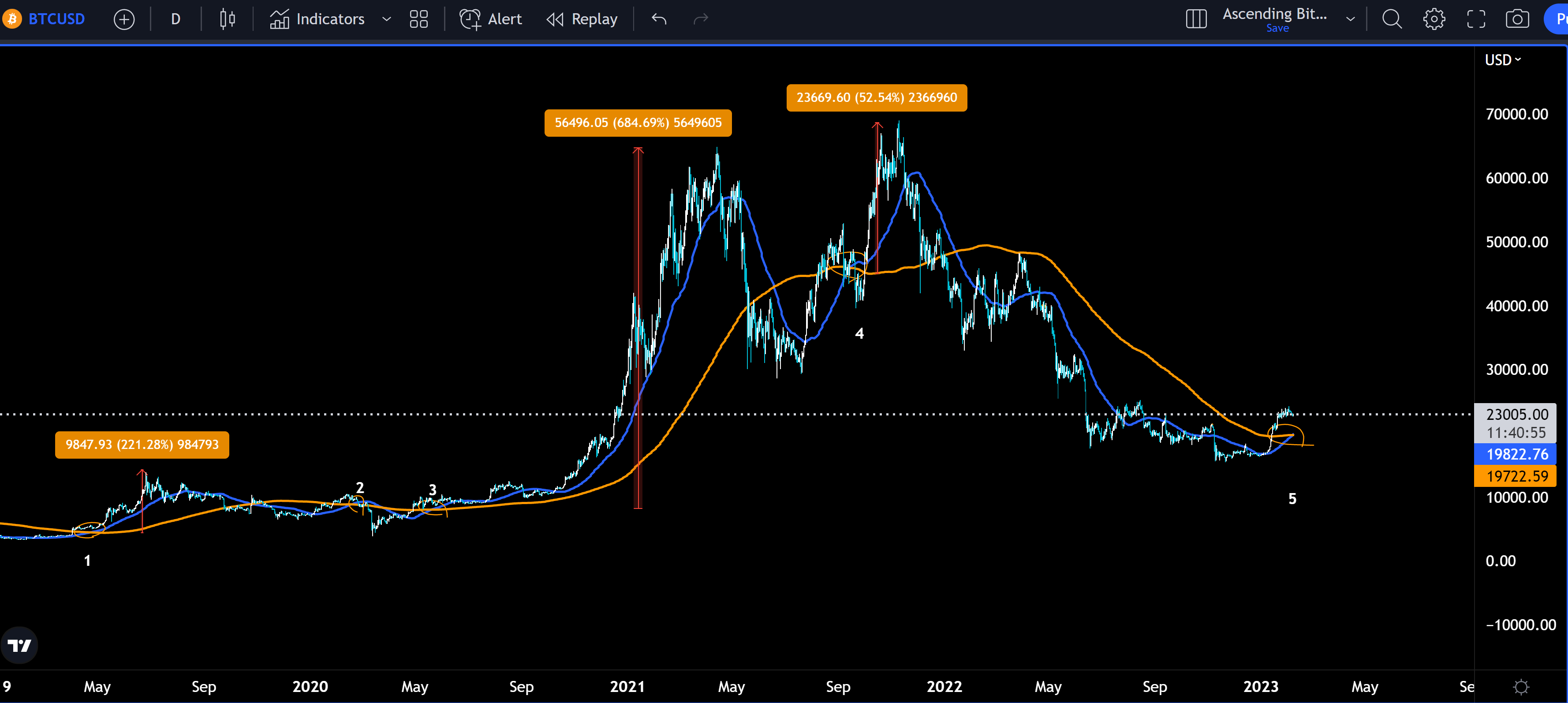 The fourth cross many now argue is the scam pump inflated by over leveraged borrowing of firms like 3AC and Alameda. It was short lived, only saw a 50% rise in price and resulted in the current ATH for BTC.