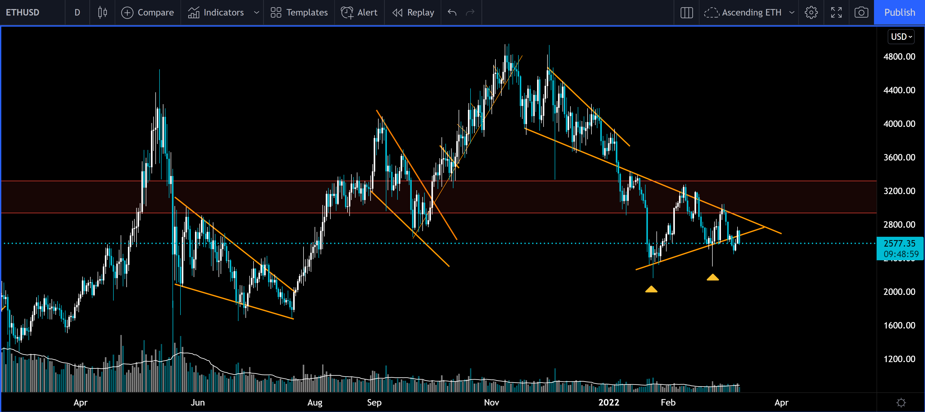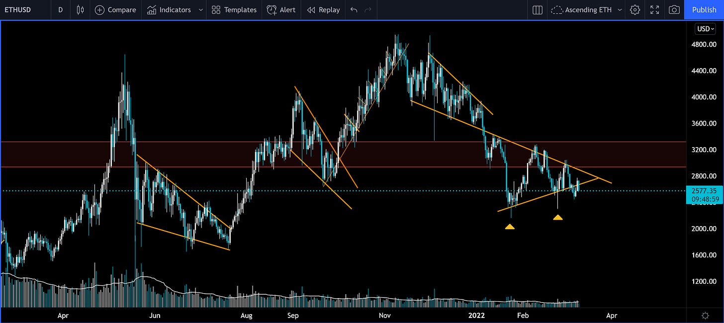 Well it did and was quickly rejected. Though, not with much magnitude. In fact while BTC’s volatility has been increasing ETH’s has been decreasing. The once wildly swinging altcoin is now stuck in a consolidation pattern with tightening volatility. Pay close attention to the ETH/BTC ratio in the coming months. With competitors like LUNA climbing the ranks ETH’s price may suffer relative to its star competitors and of course Bitcoin.