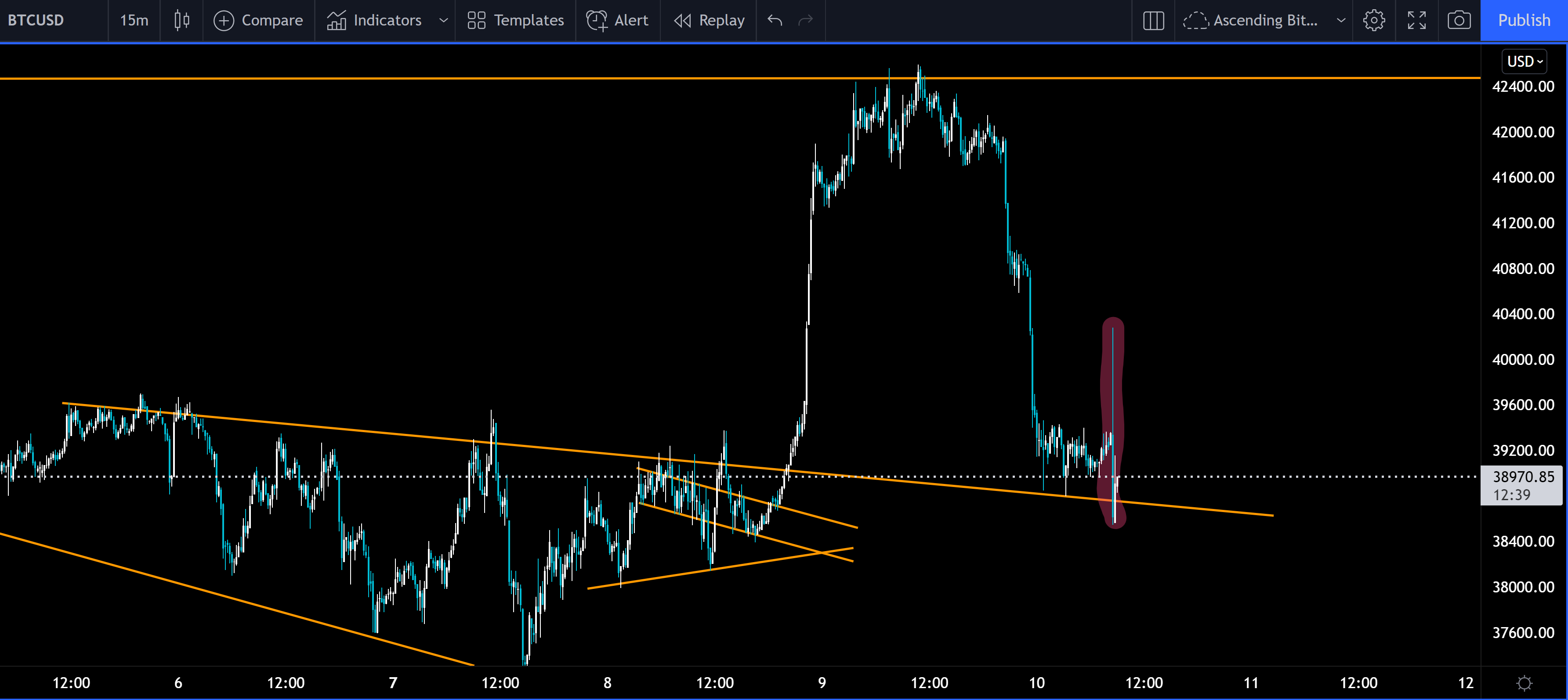 Don’t expect to run out and place a bid based on this analysis. I just want to comment this morning on how absurd this price action is. It’s like the last day didn’t happen. Bitcoin’s price ran up to the resistance at $42.5k where it had previously held support before breaking down to $37k. Now, last night the whole move up was retraced and this morning we get this huge wick back above $40k which sold off almost instantly. My personal experience trading Bitcoin has lead me to observe that these wicks tend to fill. What I mean is often I see the price climb up slowly and retest the top of the wick. I would just exert caution here. The market appears thin, lacking participants, because how else could you get this crazy price action.