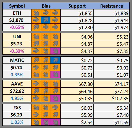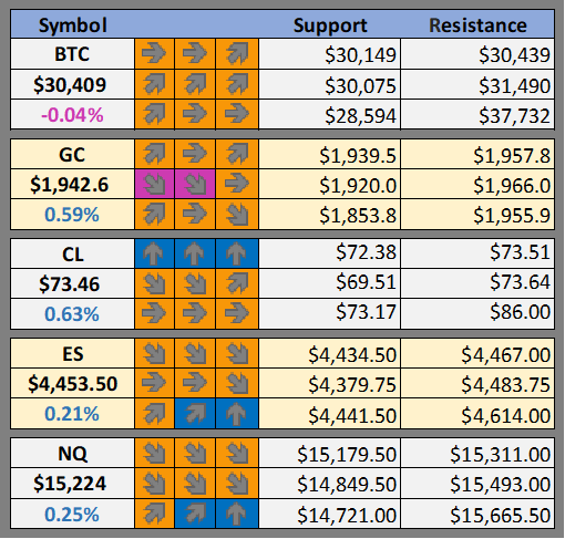 Current support and resistance ranges plus our bias on top cryptos, oil, and stocks.