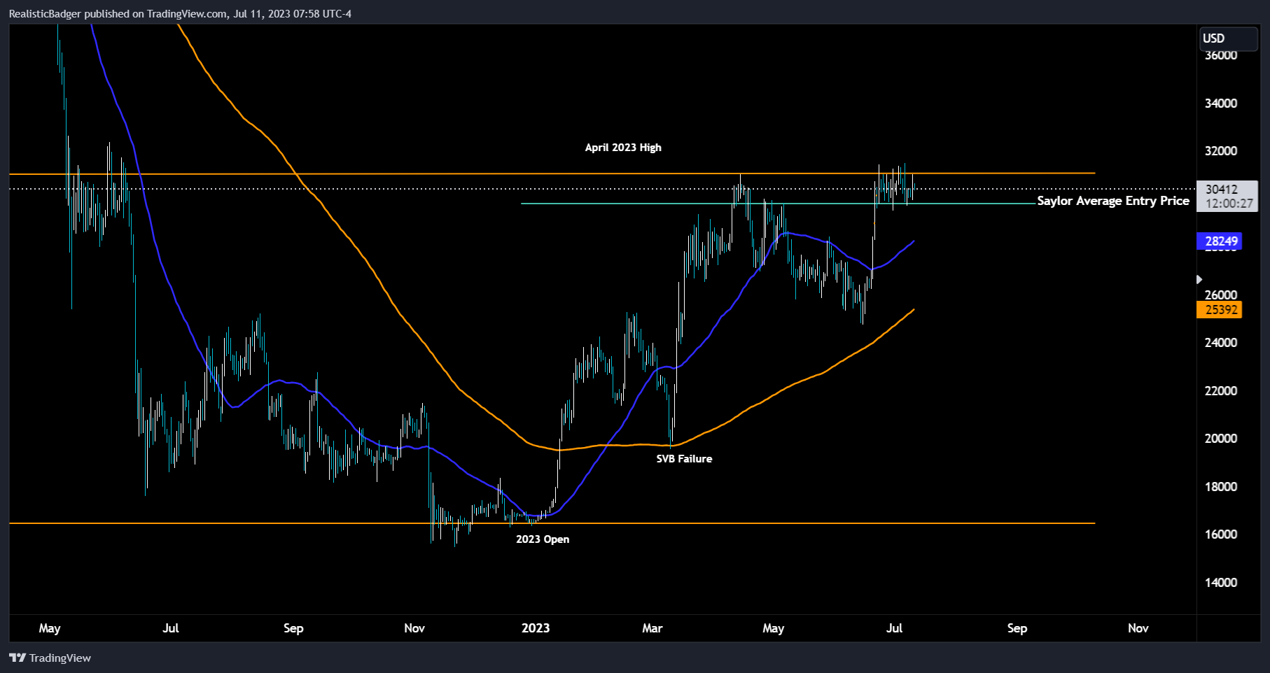 BTC continues to consolidate just above $30,000 and is consistently finding resistance near the April 2023 local high, just below $32k.