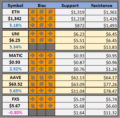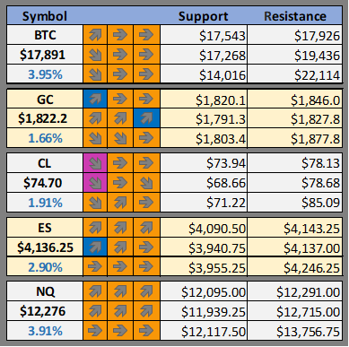Support and resistance levels and our daily, weekly and monthly bias on BTC, GOLD, OIL, ES, and NQ as well as our favorite altcoins
