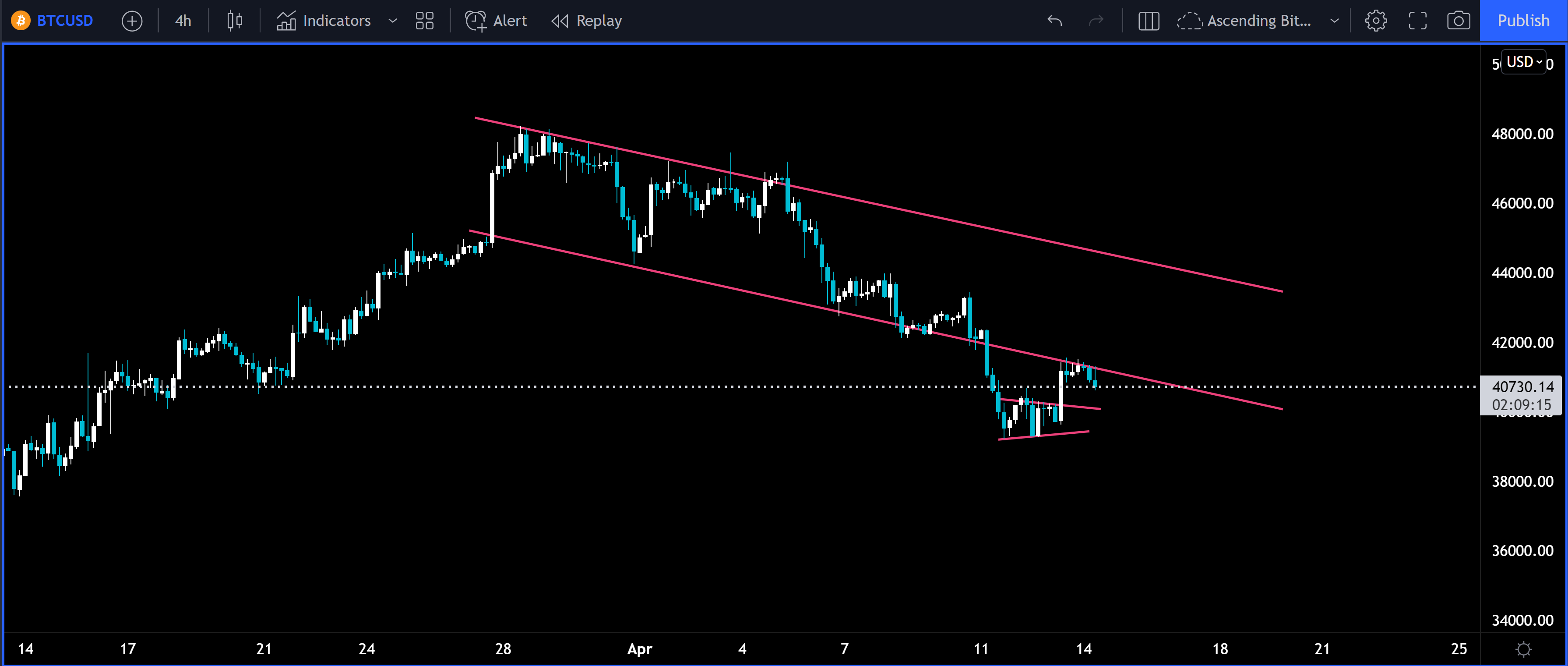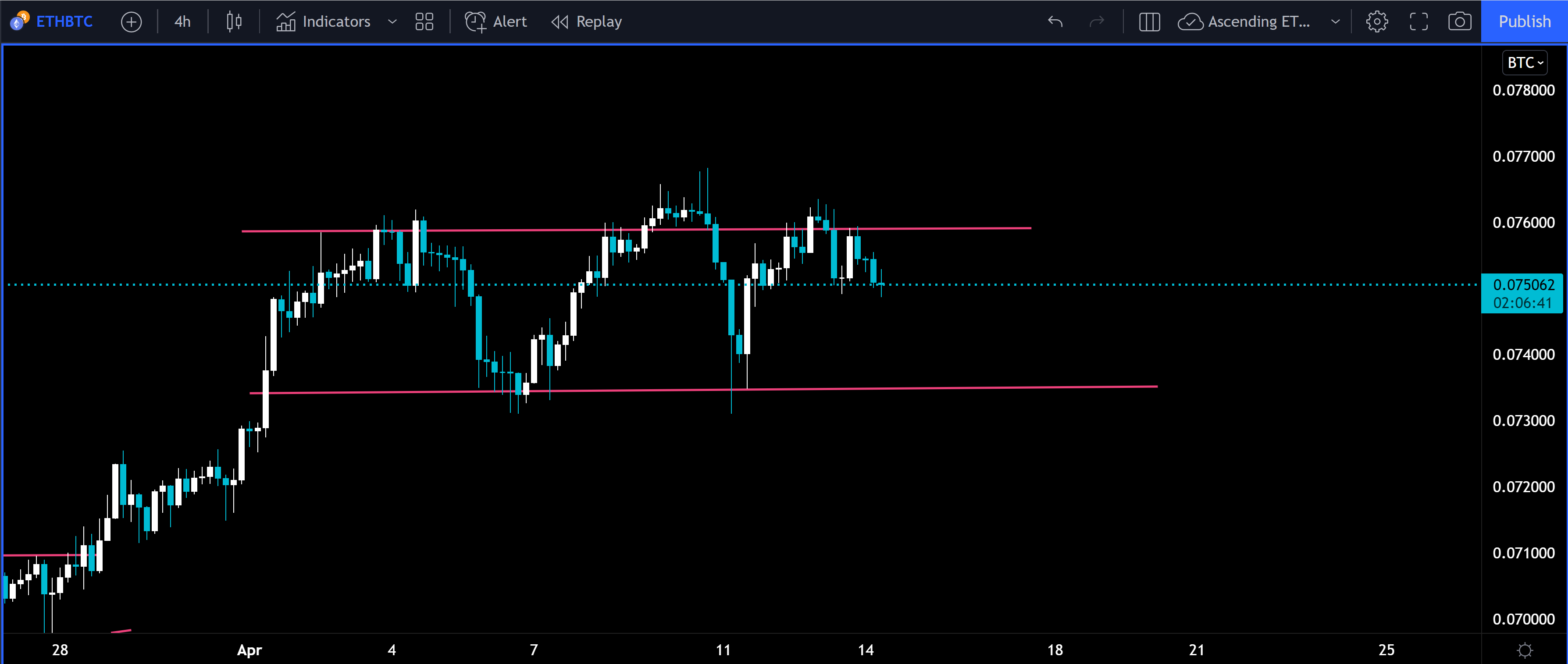 BTC is attempting to get back into the downward channel we’ve been following since the beginning of April. The price fell last week to retest the consolidation in early and mid-March. Support was found and now BTC is back at the bottom side of this channel and so far, the bottom side has been acting as resistance. It’s very common in markets for old support to become new resistance. If the short-term selling that started at the end of March is truly over then BTC will climb back into this channel and make a run up to $44k. Until the top side of this channel is broken there will likely be more downward price action in the mid-term.