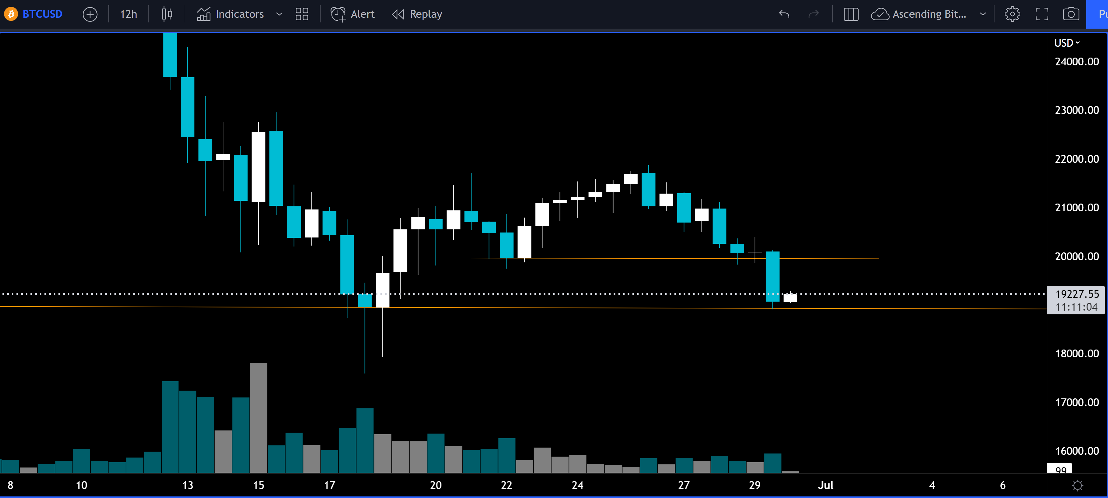 Here’s the line in the sand we mentioned in our Weekly Update Yesterday, and this morning BTC has help that as support so far. Notice also that very little volume came in during last night’s sell off. The next 12 hour candle will be important to watch. This will extend through today’s wall street trading hours and into the evening. If BTC stays above $19000 today we’d expect a retest of $20k and only when $20k is rejected as resistance would we expect $19000 to then begin to fail as support. It’s also entirely possible this current 12 hour candle never makes it above $19400 and sellers pour in. All of this isn’t exactly telling of where the price will be going next so stick to the Cheat Sheet bias and support and resistance levels. When things become uncertain the Cheat Sheet has been the best resource for understanding when trends will continue or turn arounds are likely.