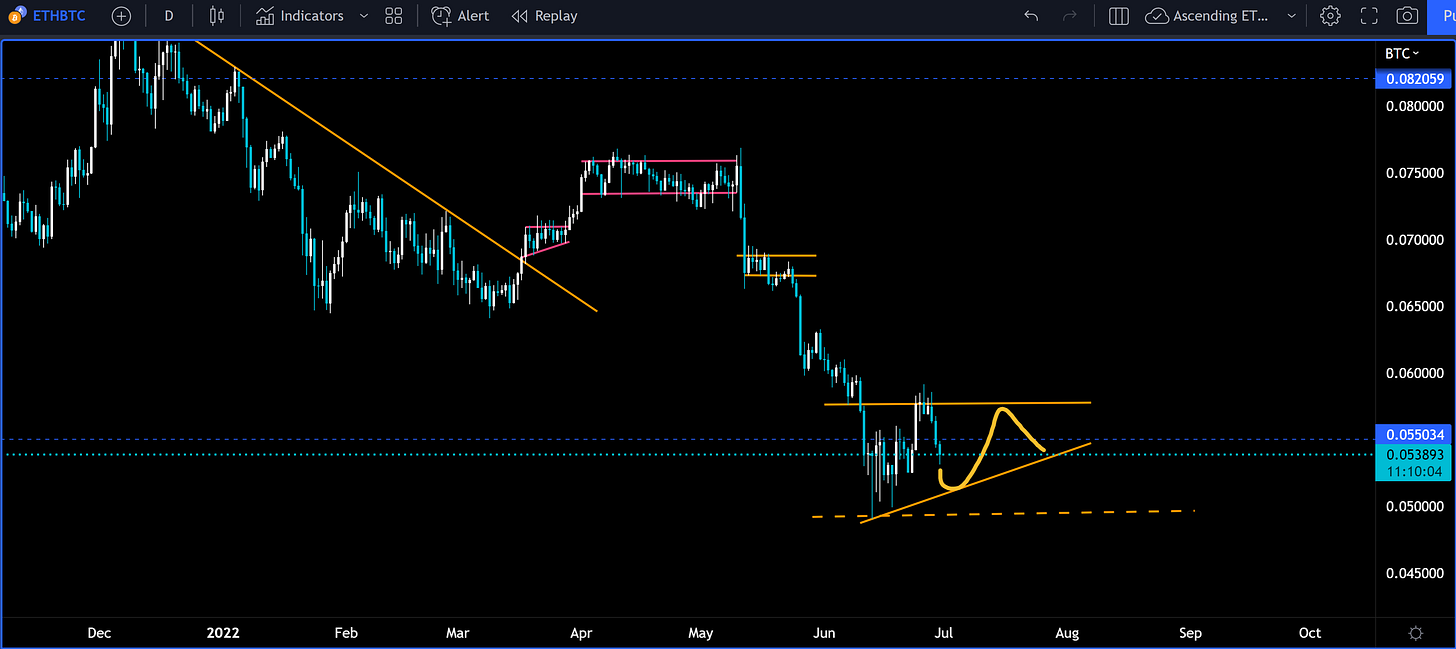 Checking back in on the ETH/BTC ratio this morning you can see that there has been a lot of consolidation around the 0.055 level that we pointed out some time ago. This is an important level because it represents the breakout point from May 2021 when ETH began is run to $4000+. The consolidation is still young and patterns can morph, but it appears to be forming a rising wedge. This is a bearish formation, however, there is probably an opportunity here for a swing trade as ETH/BTC is likely to retest 0.055 and then possibly 0.06. So, with tight stop losses one could try and buy the bottom of this pattern and short the top. If this pattern does breakdown it’s important to watch this dashed line just under 0.05. A bounce off that level as support would mean the pattern has shifted and consolidation will continue near 0.055.