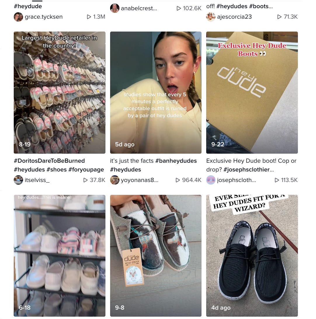 HEY DUDES The second part of the CROX story lies in the fugtastic loafers you see above. Unless you live in a Trumpy part of the USA you may have never seen these shoes. But, trust me, they are out there. Just do some searching on Tik Tok and you will see that they share a lot of the hyperconsumer dynamics of Crocs (buying multiple pairs, customization to match personality, etc). This is a make or break acquisition for Crocs and if they pull it off they will go from being a single engine plane to a 737. The extreme bull case here is the company has the DNA for scaling multiple hyperconsumer brands in the footwear industry.